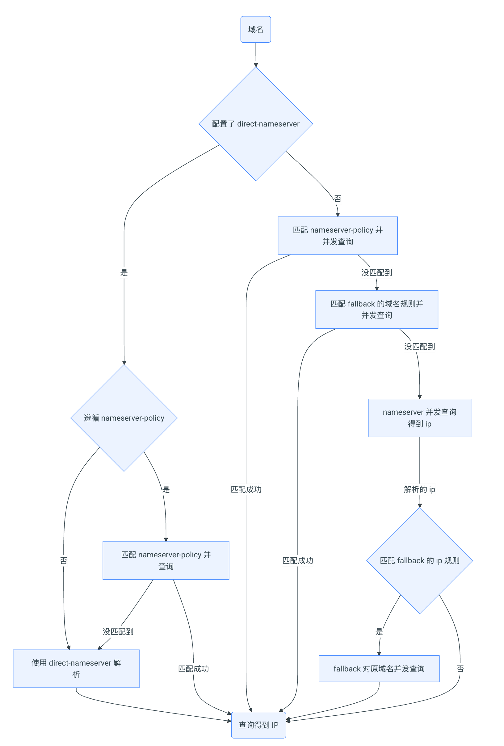 • 若解析结果为 国内 IP(geoip: CN),则使用 nameserver。