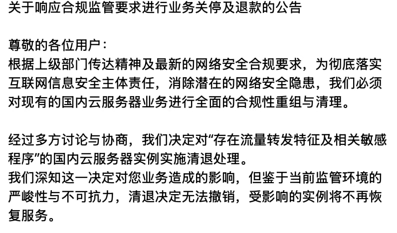 2026:上级部门要求 IDC关停“存在流量转发特征及相关敏感程序”的国内云服务器